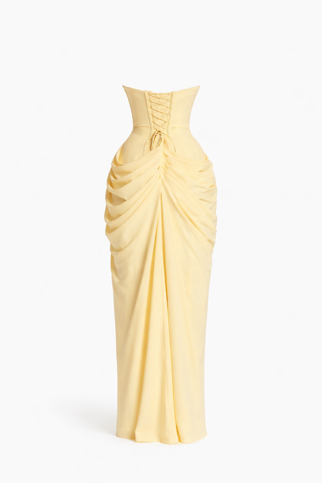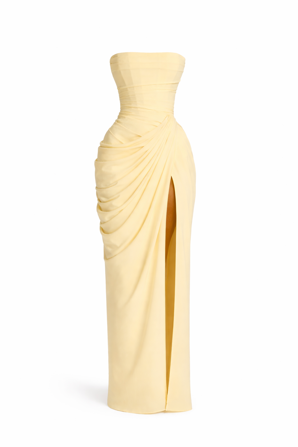 Introducing the Sonila Butter Yellow Strapless Maxi Dress, a striking fusion of structured elegance and fluid femininity. Designed for elevated occasions, this butter yellow wedding guest dress features a sculpted, boned bodice that enhances the natural silhouette while delivering a refined, supportive fit.