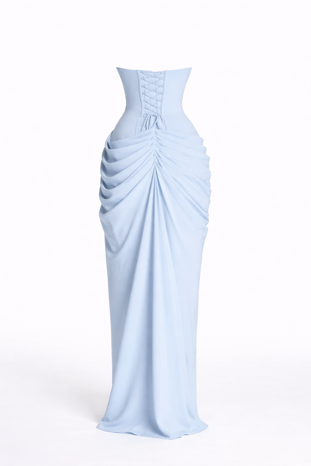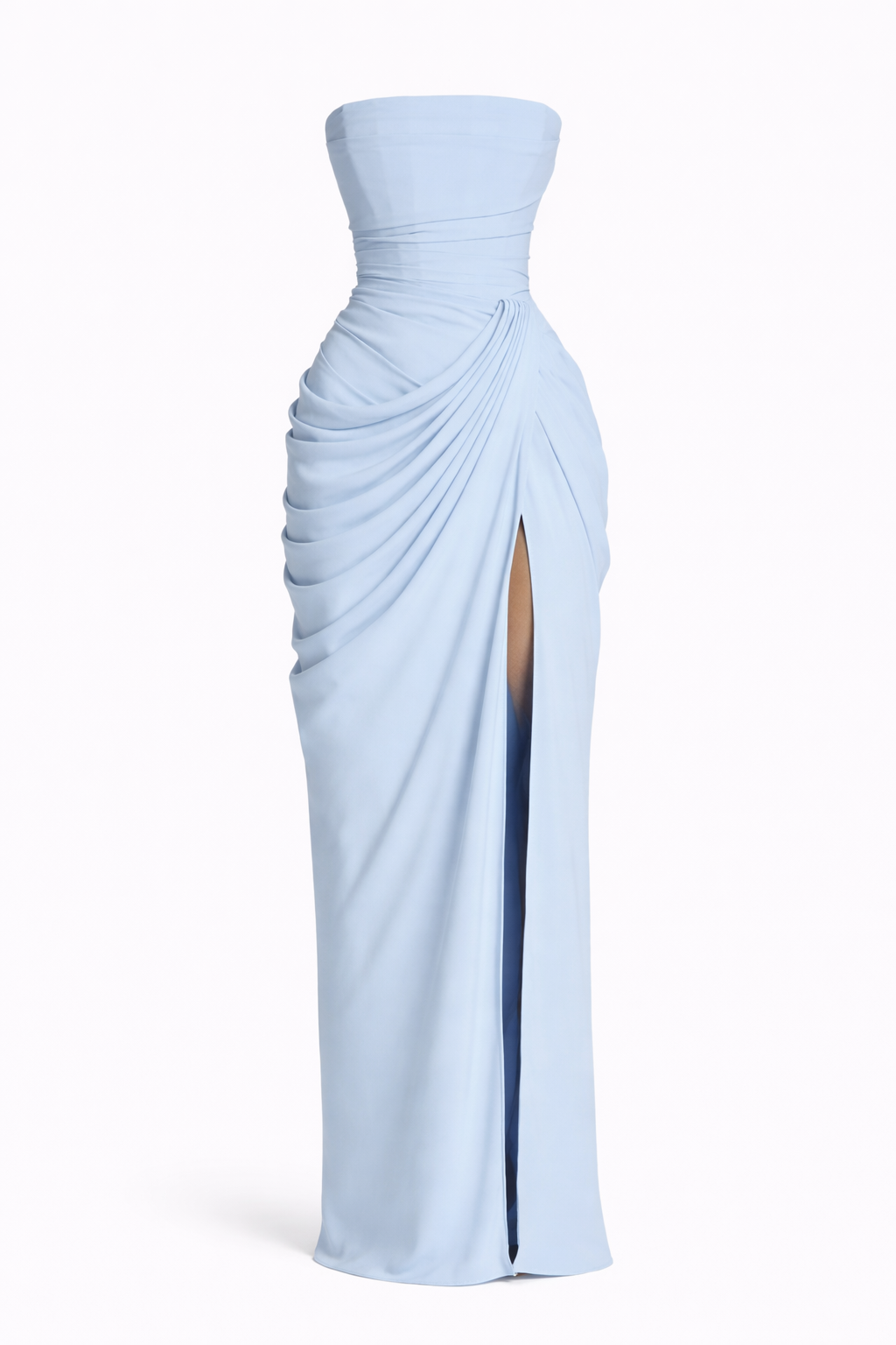 Introducing the Sonila Light Blue Strapless Maxi Dress, a refined expression of modern elegance designed for elevated occasions. This light blue maxi dress features a structured, boned bodice that enhances and supports the silhouette, creating a clean and sculpted shape.