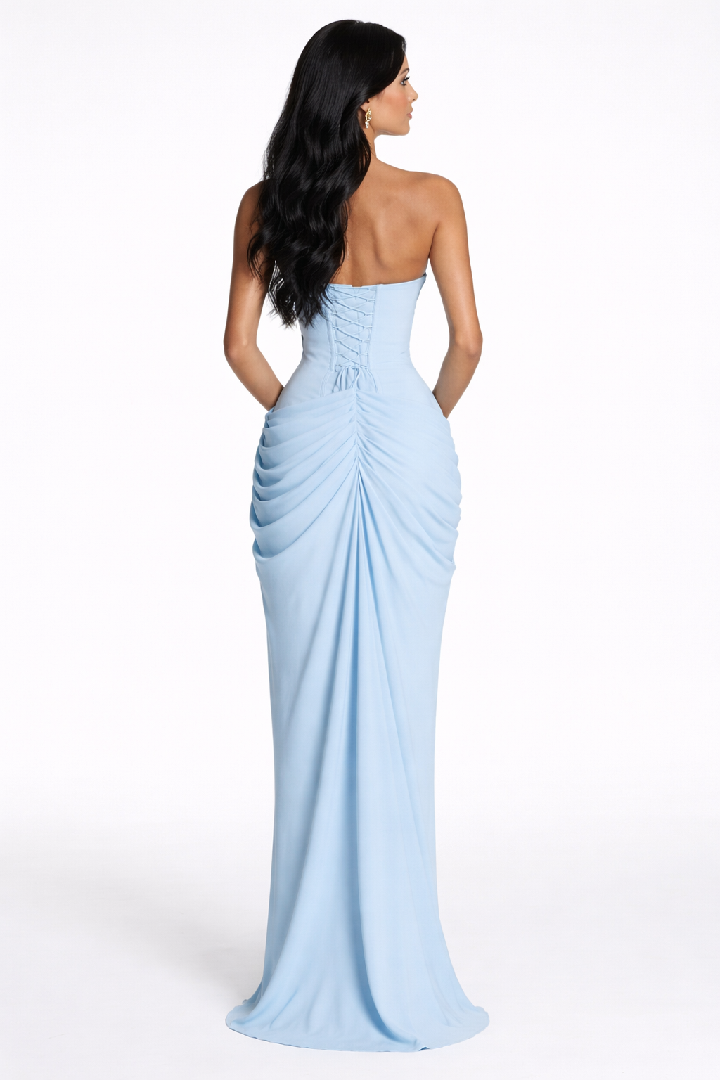 light blue wedding guest dress, maxi dress light blue, strapless light blue dress one side slit, blue formal dress women, off shoulder blue dress, ruched light blue maxi dress, boned bodice evening dress, light blue evening gown with slit, fitted strapless maxi dress blue, lace up back dress blue, elegant blue occasion dress