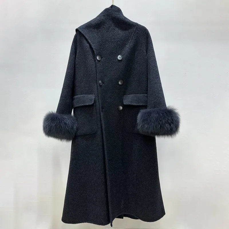 100% Wool Coat with Integrated Scarf & Removable Fox Fur Cuffs