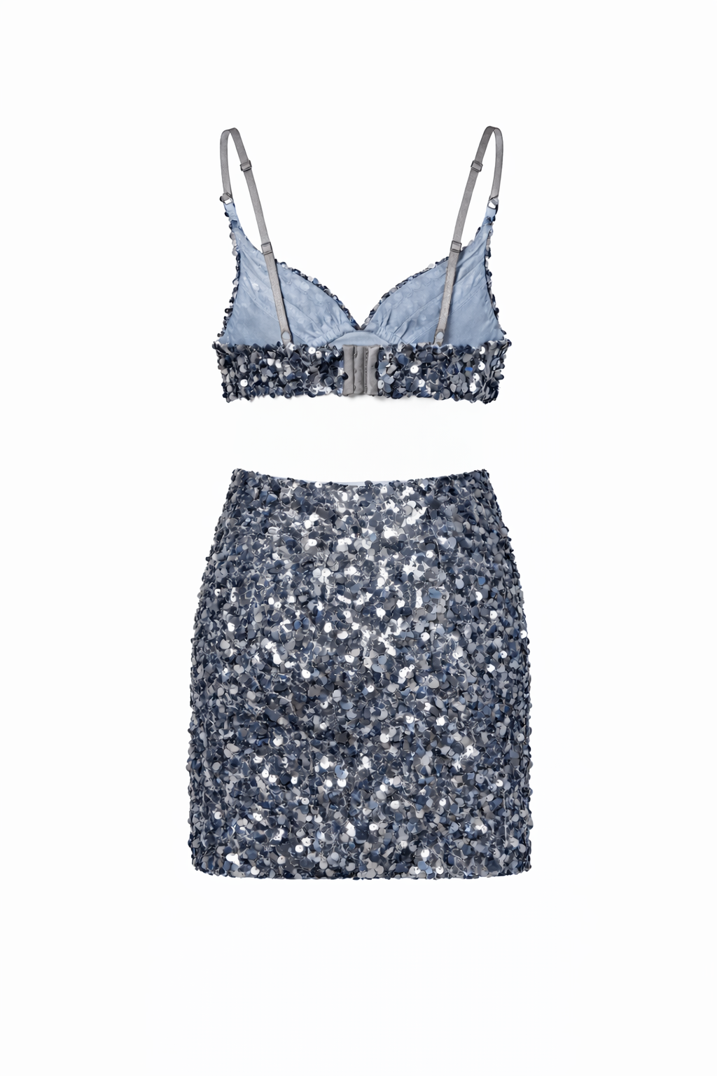 The soft baby blue tone gives this outfit a fresh, elevated summer feel while the hand-stitched sequins create high-impact sparkle. Whether styled for a birthday celebration, engagement party, summer event, cocktail night, or glam rooftop party, this set delivers bold confidence with refined sophistication.