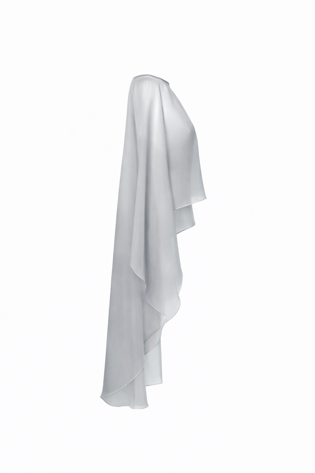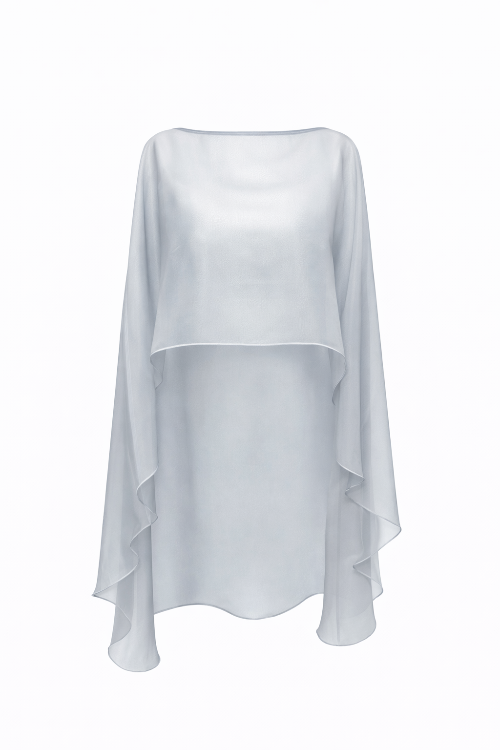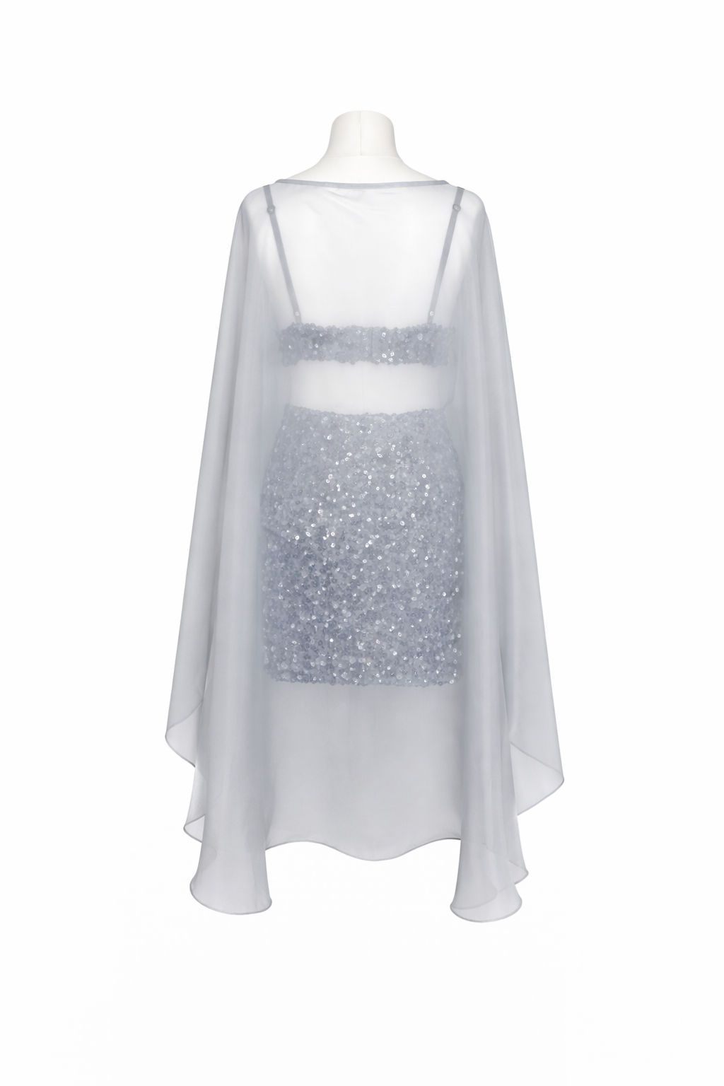 The bustier features adjustable straps and a fully adjustable back closure for a secure and customizable fit. The mini skirt contours the body while remaining comfortable, and the lightweight sheer cape drapes effortlessly over the shoulders for a luxury layered effect.