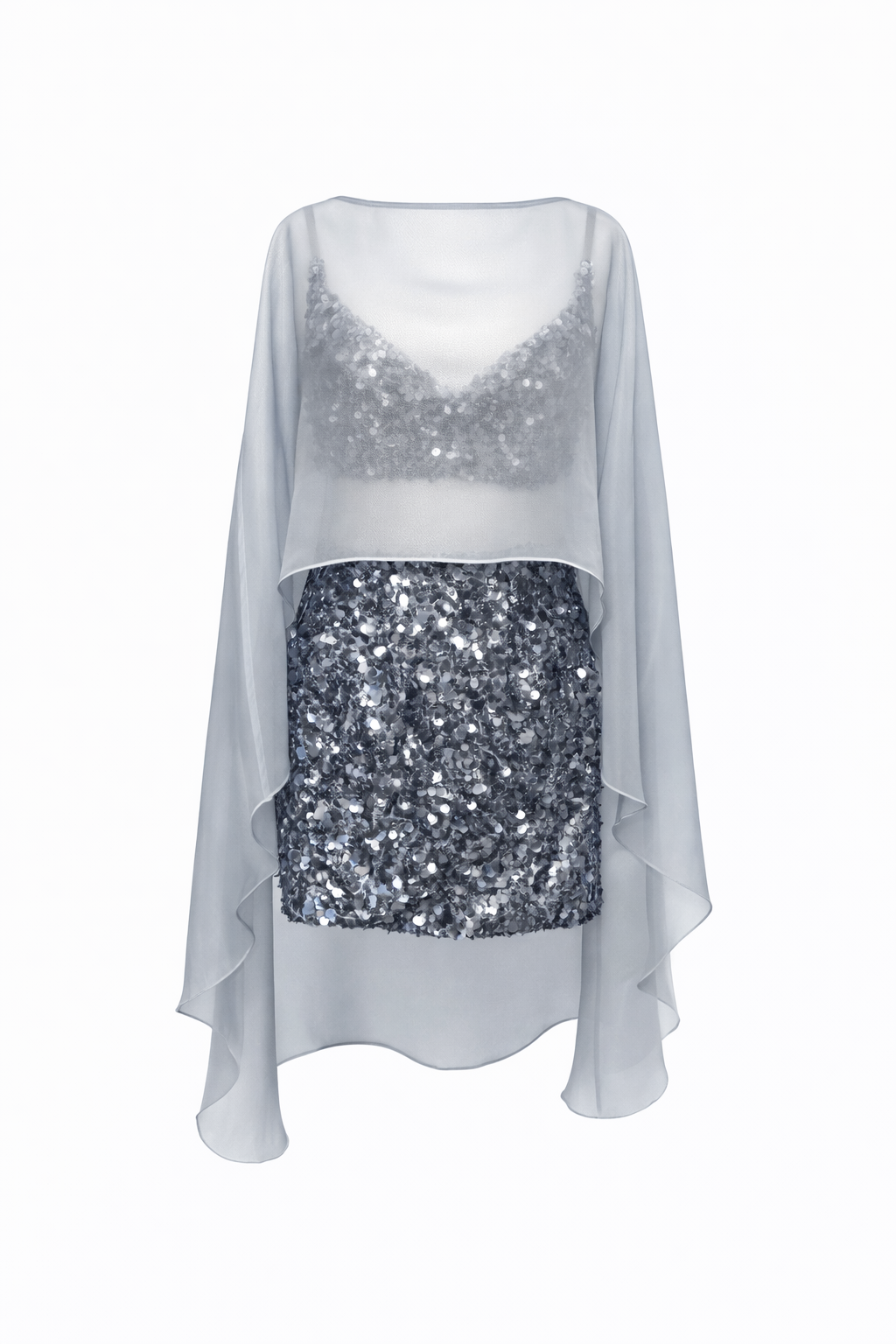 The Sparky 3 pcs set is the ultimate baby blue summer glam outfit designed to turn heads at every party. This three-piece sequin set features a shimmering adjustable bustier, a high-waisted mini skirt, and a flowing sheer cape that adds dramatic movement and elegance.