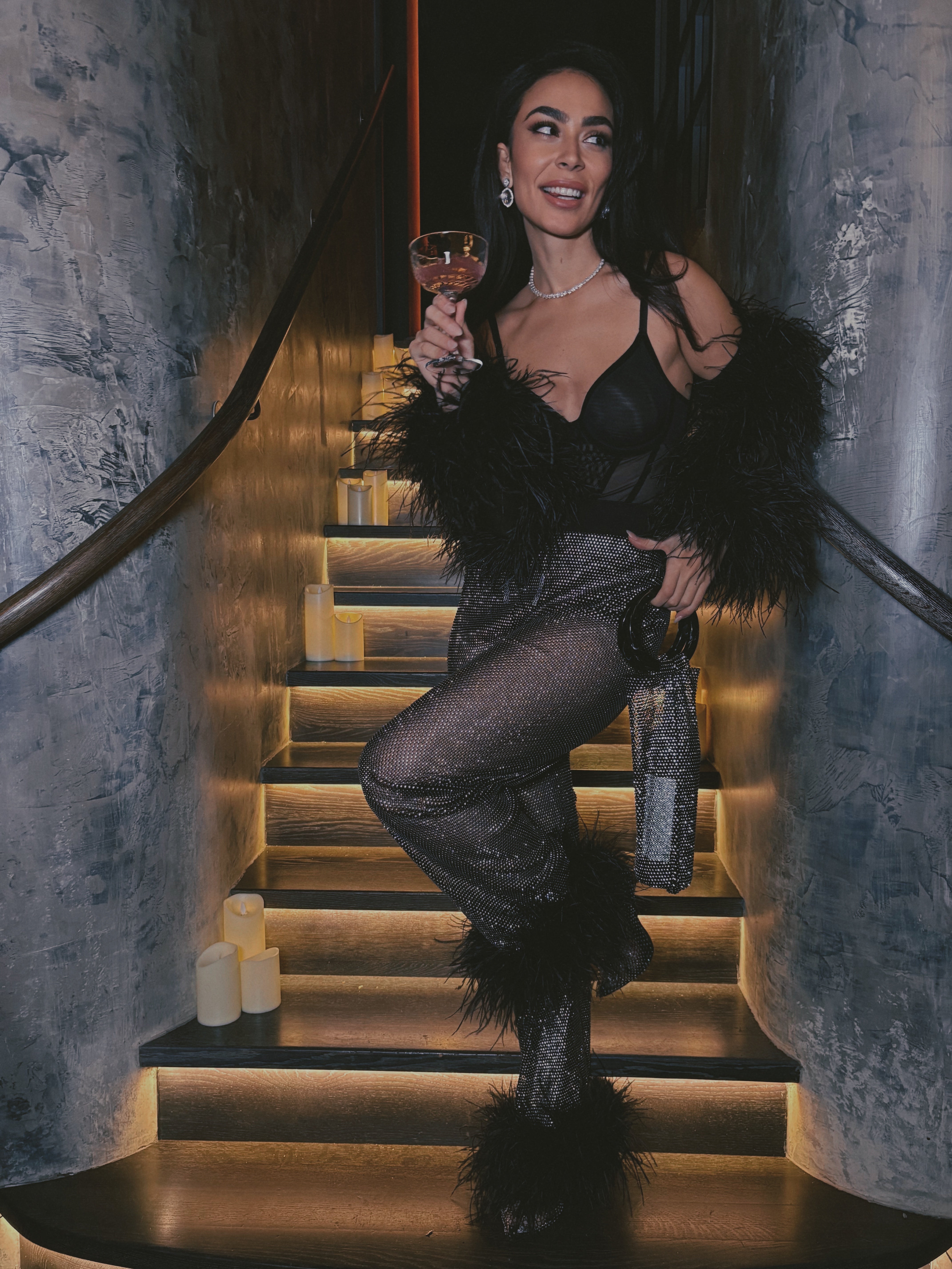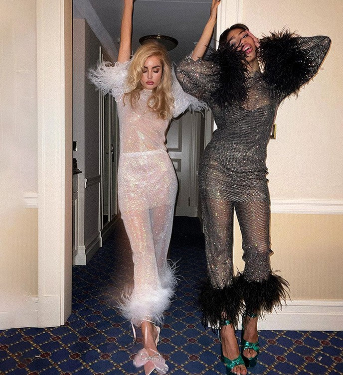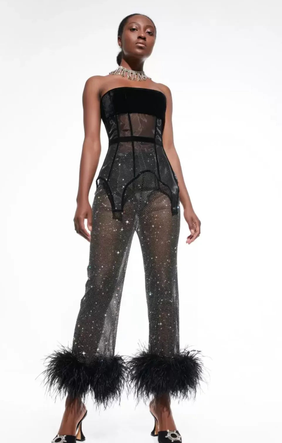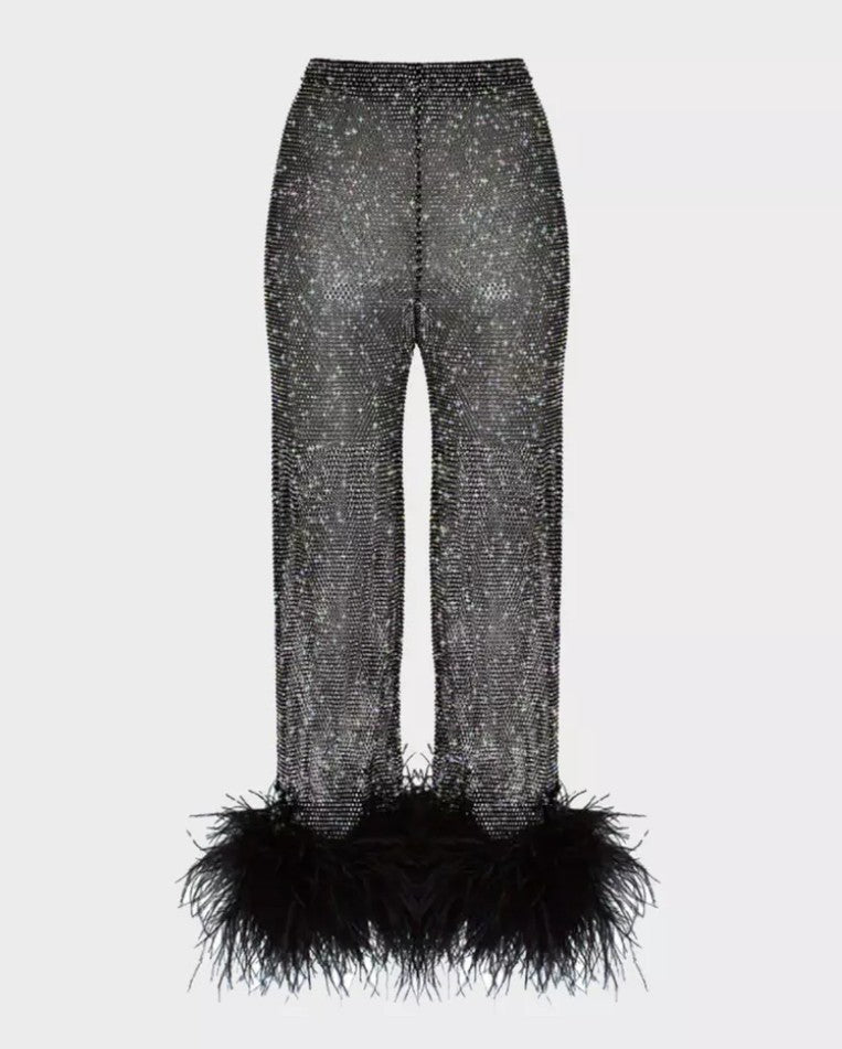 Celestia | Crystal Sheer Pants with Ostrich Feather Hem