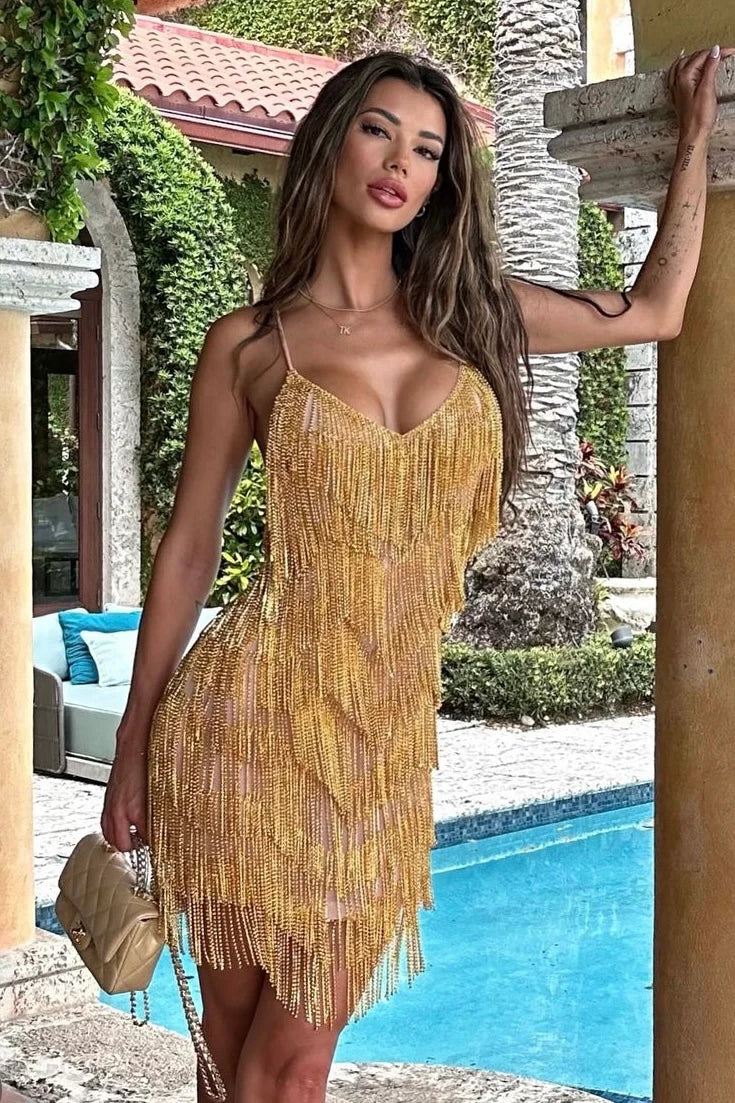 Diamante Gold Rhinestone Fringe Tassel Dress – Backless Nude Mesh Mini Party Dress for New Year / Silvester Celebration