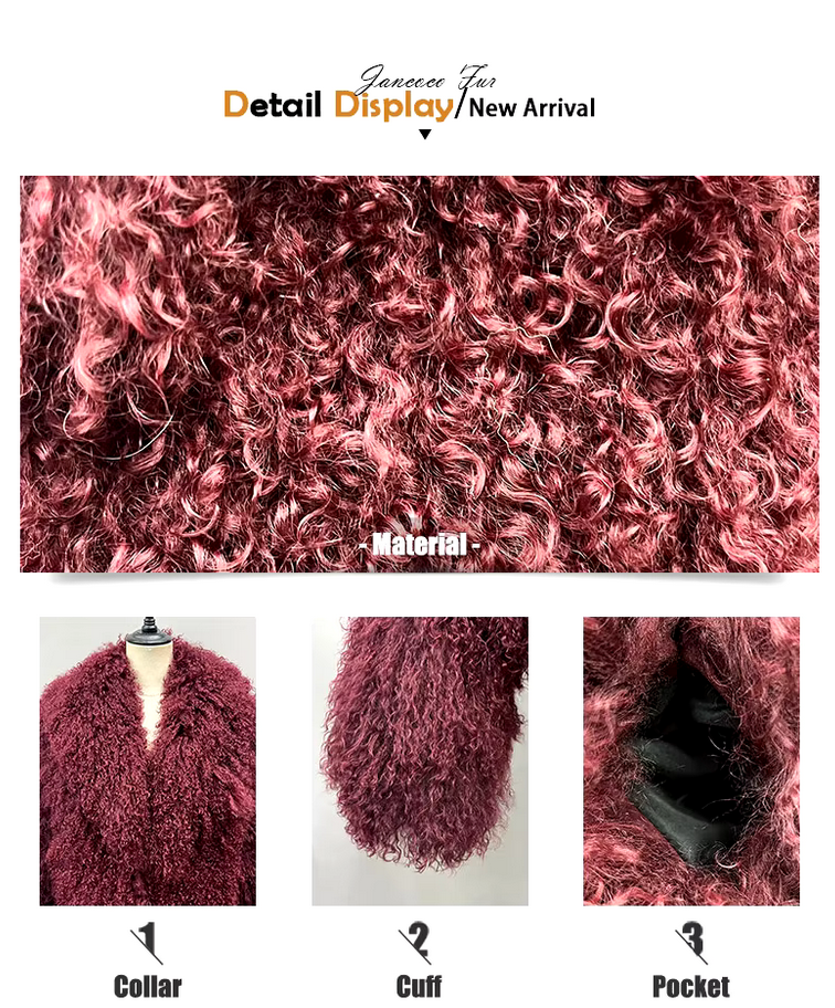 SEO Keywords: Mongolian fur jacket coat, real sheep fur coat, warm fluffy big collar coat, elegant winter fur jacket, cropped Mongolian lamb fur coat, women’s fur coat, luxurious winter outerwear, wine red fur coat, burgundy sheep fur jacket.