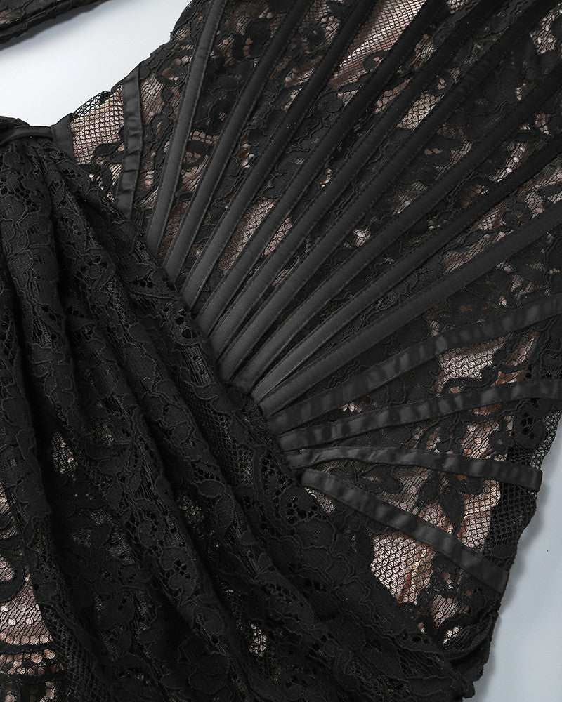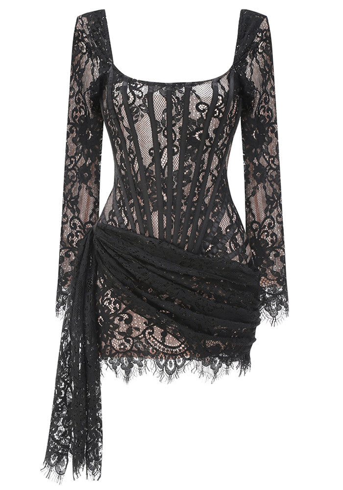 The Polina Lace Mini Dress captures the essence of dark glamour and Parisian elegance. From its corseted waist to the drama of its side-trailing lace panel, this dress is designed to flatter, contour, and captivate. The combination of soft sheer sleeves and architectural boning gives it both delicacy and power.
