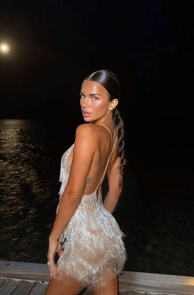 ntroducing Diamante — a meticulously handcrafted silver rhinestone fringe dress, designed for those who demand elegance, exclusivity, and standout detail. Featuring a barely-there nude mesh base and shimmering silver tassel overlay, this mini dress is the ultimate piece for New Year’s Eve, Silvester celebrations, birthday parties, and statement evenings.